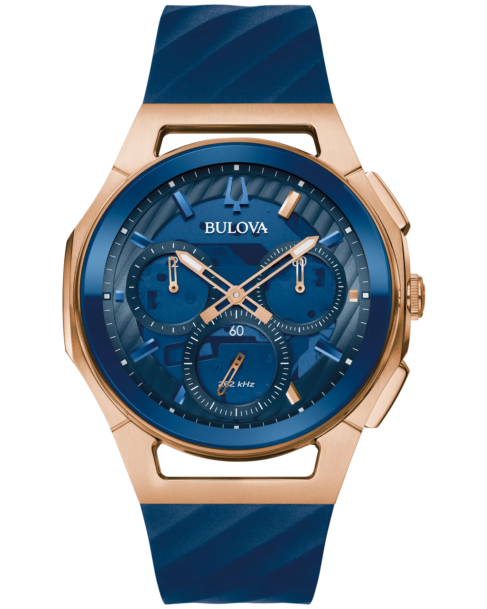 Seamlessly merging iconic Bulova watch designs with the dynamic musicality of Marc Anthony, this new addition to the Marc Anthony collection puts the legendary artist’s spin on the groundbreaking men’s CURV chronograph. With a rose gold-tone stainless steel case with open lugs and pushers, the CURV features the world’s first curved chronograph movement, with a dramatic curved sapphire crystal and a curved case back that gives it an effortless presence on the wrist. Mirroring the bold rhythm of Anthony’s music, the translucent blue five-hand chronograph dial brings a refreshing palette to the CURV collection and offers a glimpse at the curved chronograph movement featuring our proprietary high-precision 262 kHz quartz technology with exceptional accuracy of seconds per year. The 1, 3, and 5 hours marked by applied rose gold-tone markers highlight Marc’s personally significant numbers. Three sub-dials display the elapsed chronograph time in 12-hour, 60-minute, and 60-second intervals. The chronograph 60-second sub dial at 6 o’clock doubles as the standard second hand; the dual mode is actuated by the 4 o’clock pusher. Paired with a matching blue silicone strap with a rose gold-tone pin buckle, the new Bulova x Marc Anthony CURV is a demonstration of Marc Anthony’s musical range and cross-generational appeal that sets a new standard for inspired timekeeping.